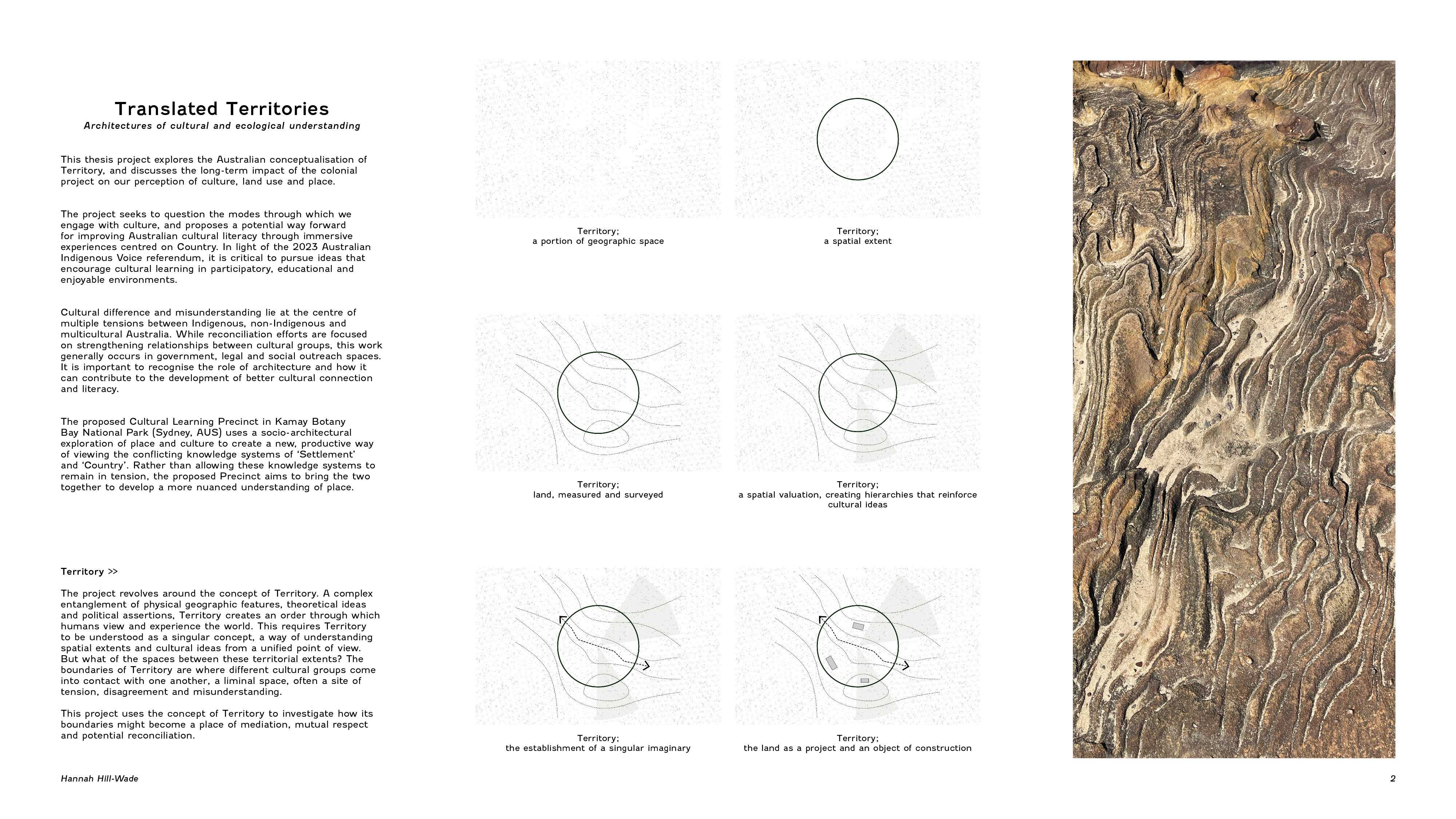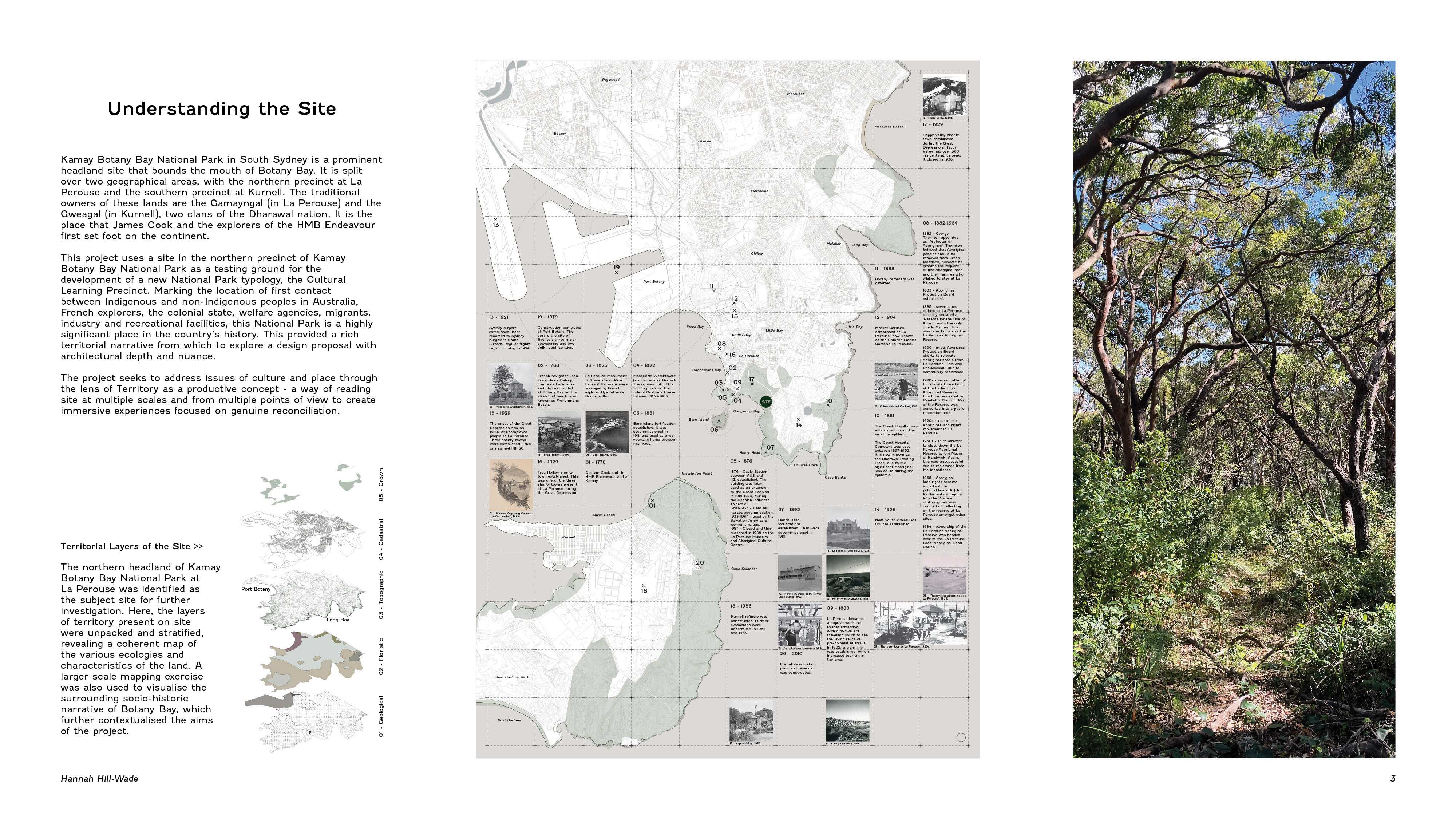 This thesis project explores the Australian conceptualisation of Territory and investigates how an architectural exploration of place and culture might create a new, productive way of viewing the conflicting knowledge systems of ‘Settlement’ and ‘Country’. This project uses Kamay Botany Bay National Park as a testing ground for the development of a new National Park typology, the Cultural Learning Precinct. It seeks to address issues of culture and place through the lens of Territory as a productive concept - a way of reading site at multiple scales and from multiple points of view to create immersive experiences focused on genuine reconciliation.