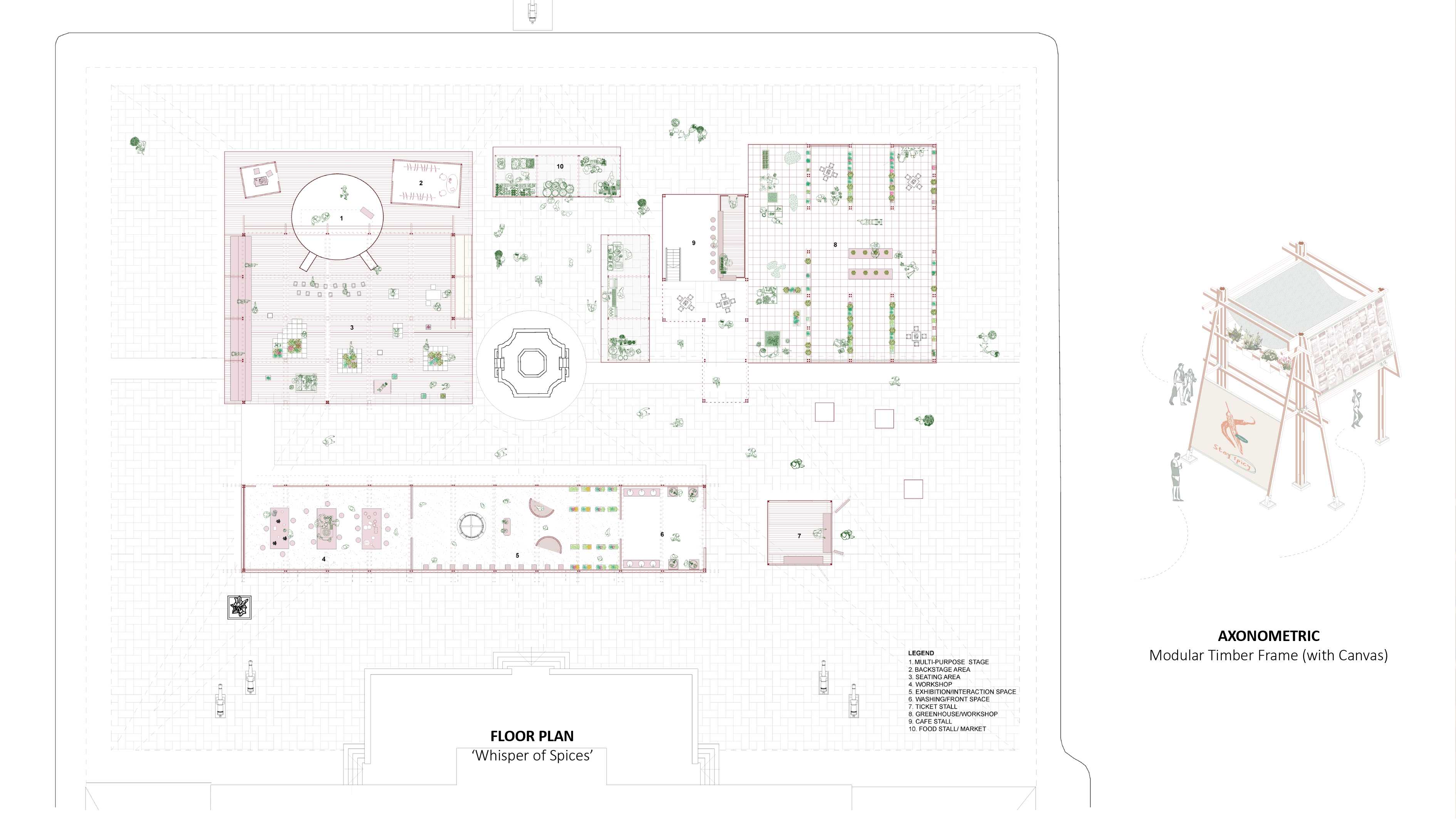 The cultivation and trade of spices has shaped Indonesia's history and carries with it a colonial culture legacy. Through the cultural medium of spices, their unique production process and historical significance builds an 'ambience' of cultural memory, and the sensations generated when people are in the space can shape their perception of the city's culture. Temporary architecture as a carrier, allowing individuals to interact with the world through their senses and to connect with the space in their experience, which allowing the collective to form a place of memory and stimulating people to reflect on the culture behind.