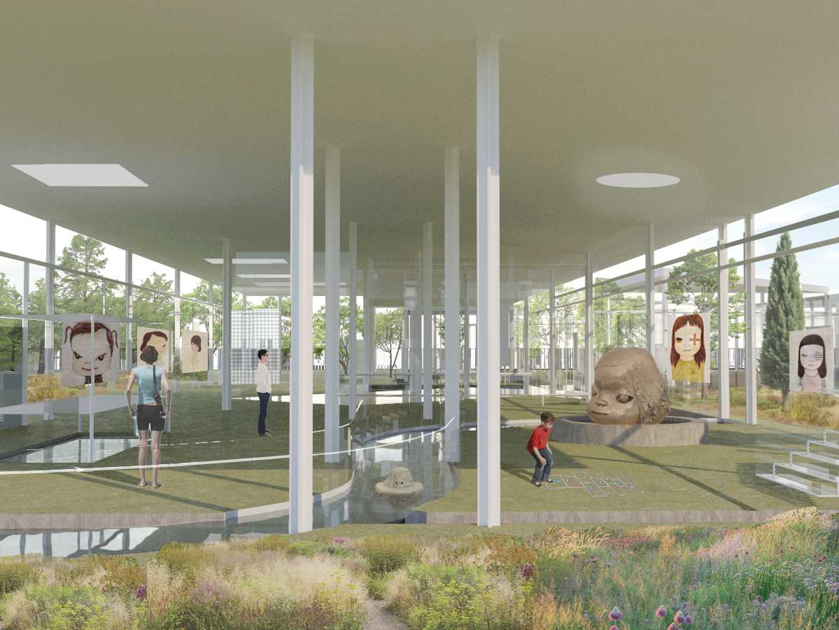 An architecture with a unified aesthetic to house the artworks of Yoshitomo Nara, the gallery architecture seeks to become a foil for Nara’s paintings and sculptures, exhibiting them in a pure way that does not distract from the art language. Certain features of Nara’s art language are embodied such as the themes of suspension and reflection, flatness, depth and proportion, the dynamic of childhood memories with more complex adult emotions, melding it into a cohesive architectural response. It is a colourless architecture aiming to direct spatial experiences rather than dominate with a strong form, order and visual language.