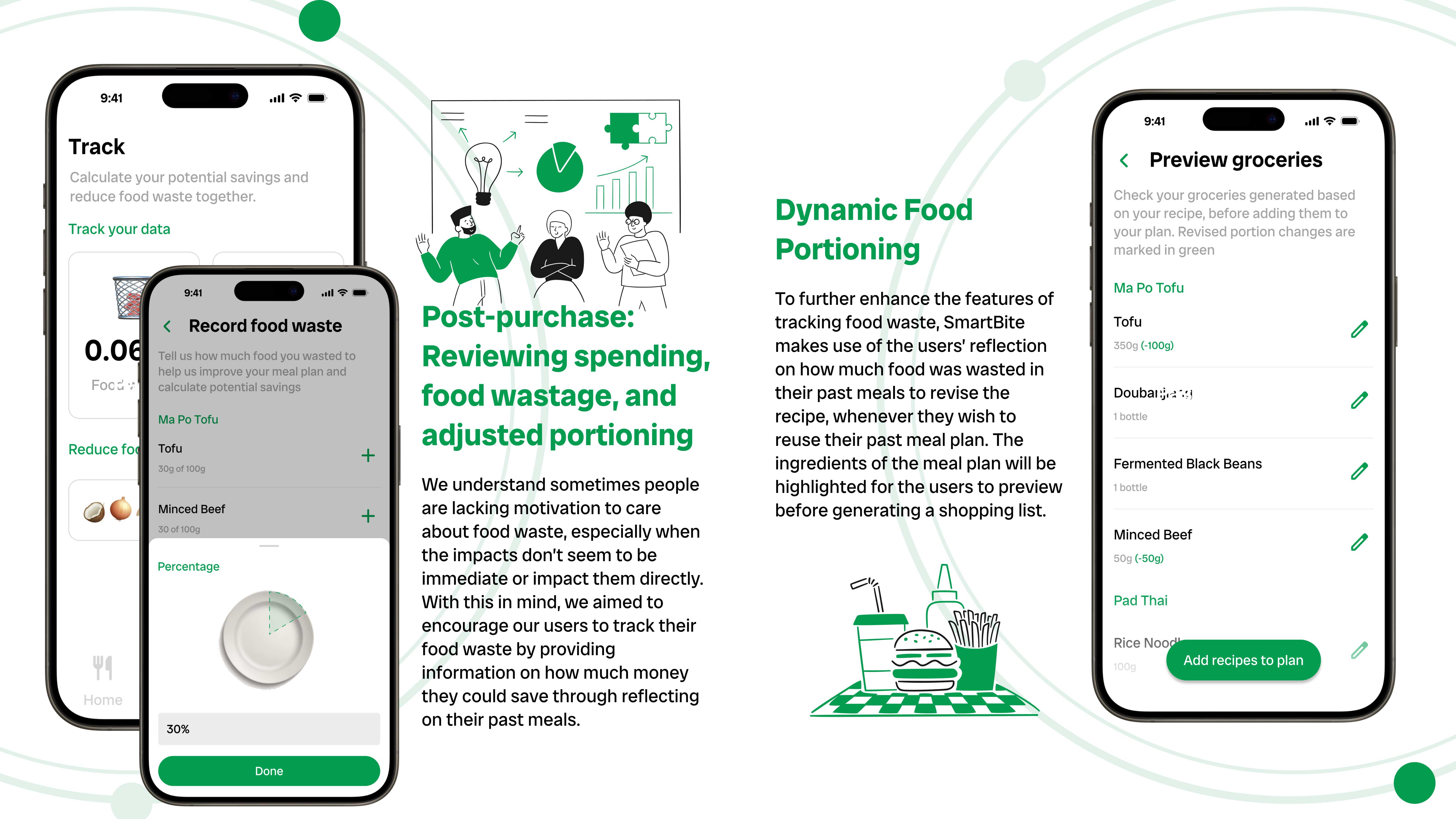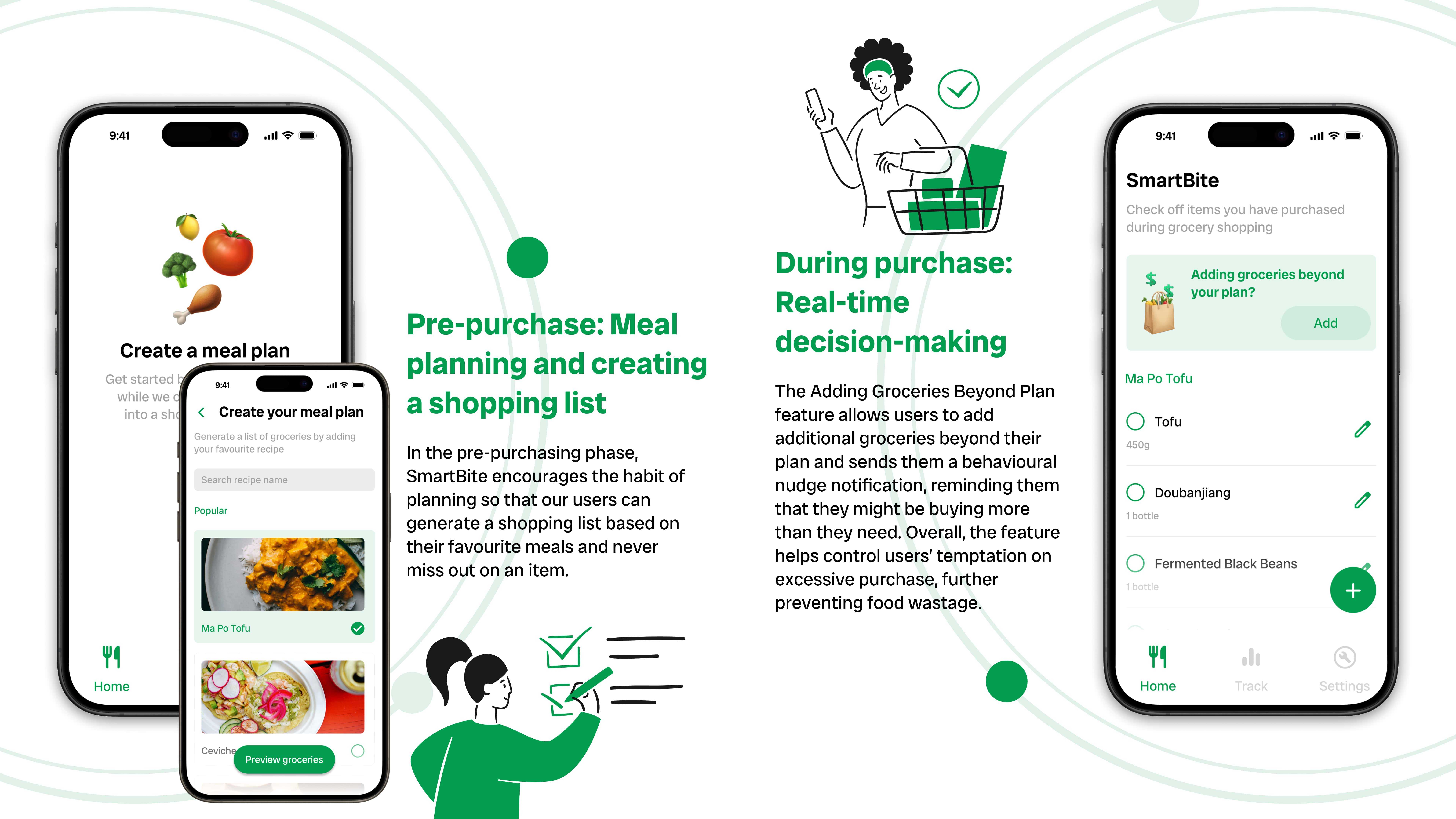With Smartbite, users can efficiently reduce their contribution to food waste, cutting food waste down, reducing grocery bills and contributing to a healthier planet with the small changes. Our approach emphasises the comprehensive food purchasing process, promoting planning and mindful decision-making that seamlessly integrates into daily routines rather than being perceived as a mere obligation.