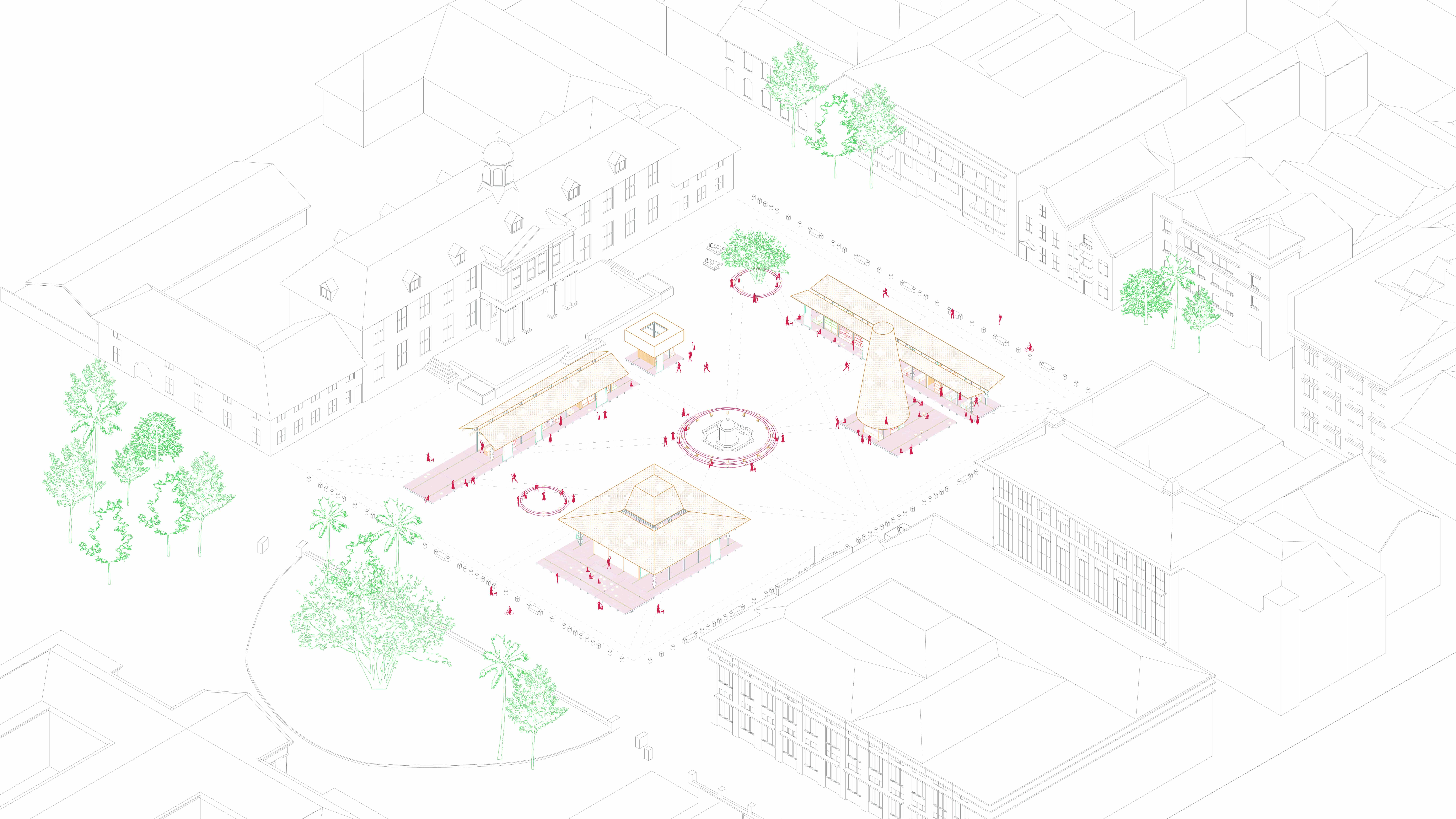 This project envisions a renewed Taman Fatahillah in Jakarta as a vital convergence of the historical and the contemporary, redefining boundaries between tradition and urban development, individual and community, private and shared. Inspired by gotong royong (collective work), it introduces a series of creative, modular spaces for collaborative activities, skill-sharing, and community-led initiatives, bringing together the essence of local culture with the demands of a modern city to foster seamless interaction between social and economic life. Furthermore, it empowers local networks and supports sustainable practices. This renewed commons responds to urban privatization and social fragmentation, offering a model of communal growth and cultural resilience through co-created, adaptable spaces for future generations.