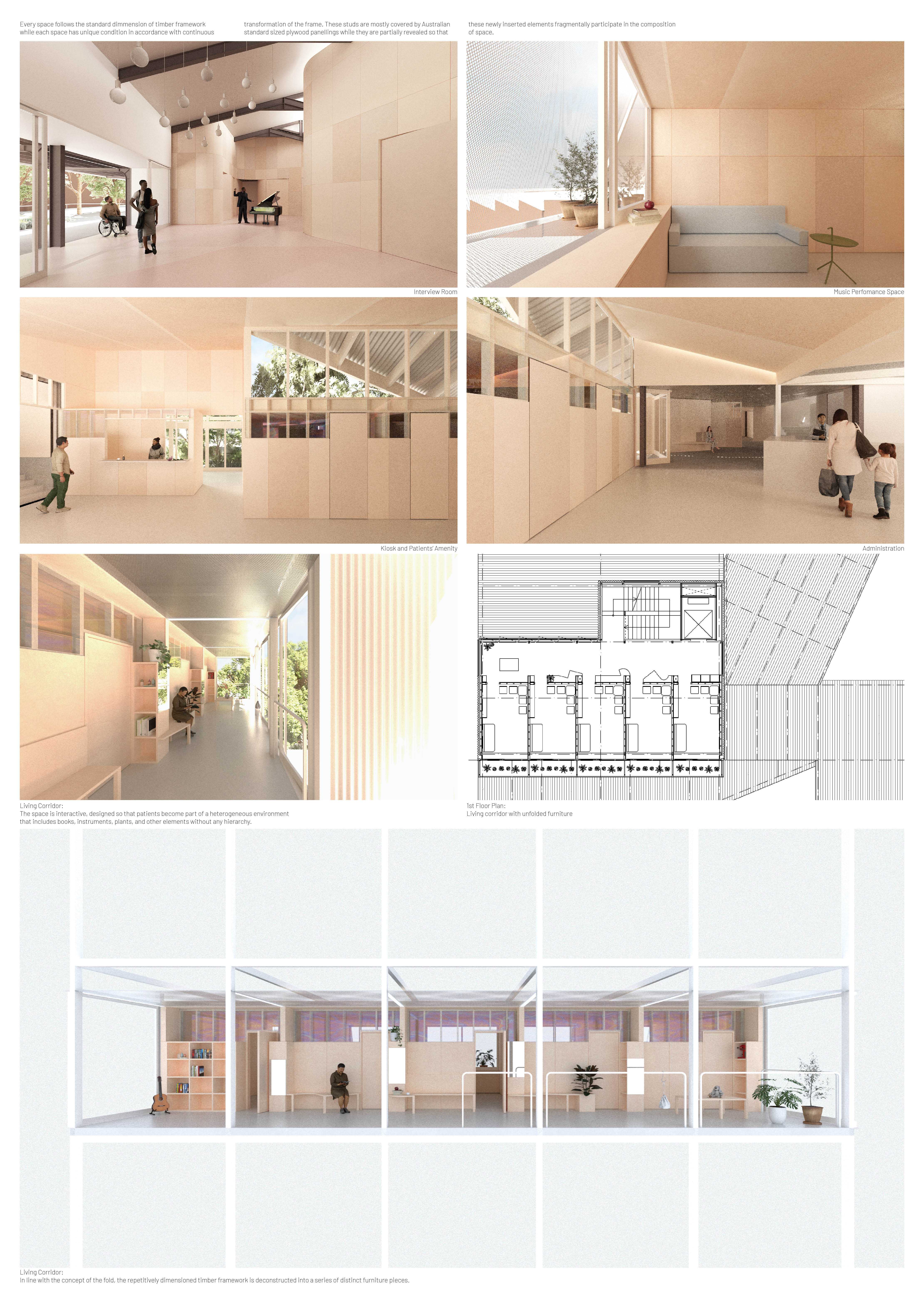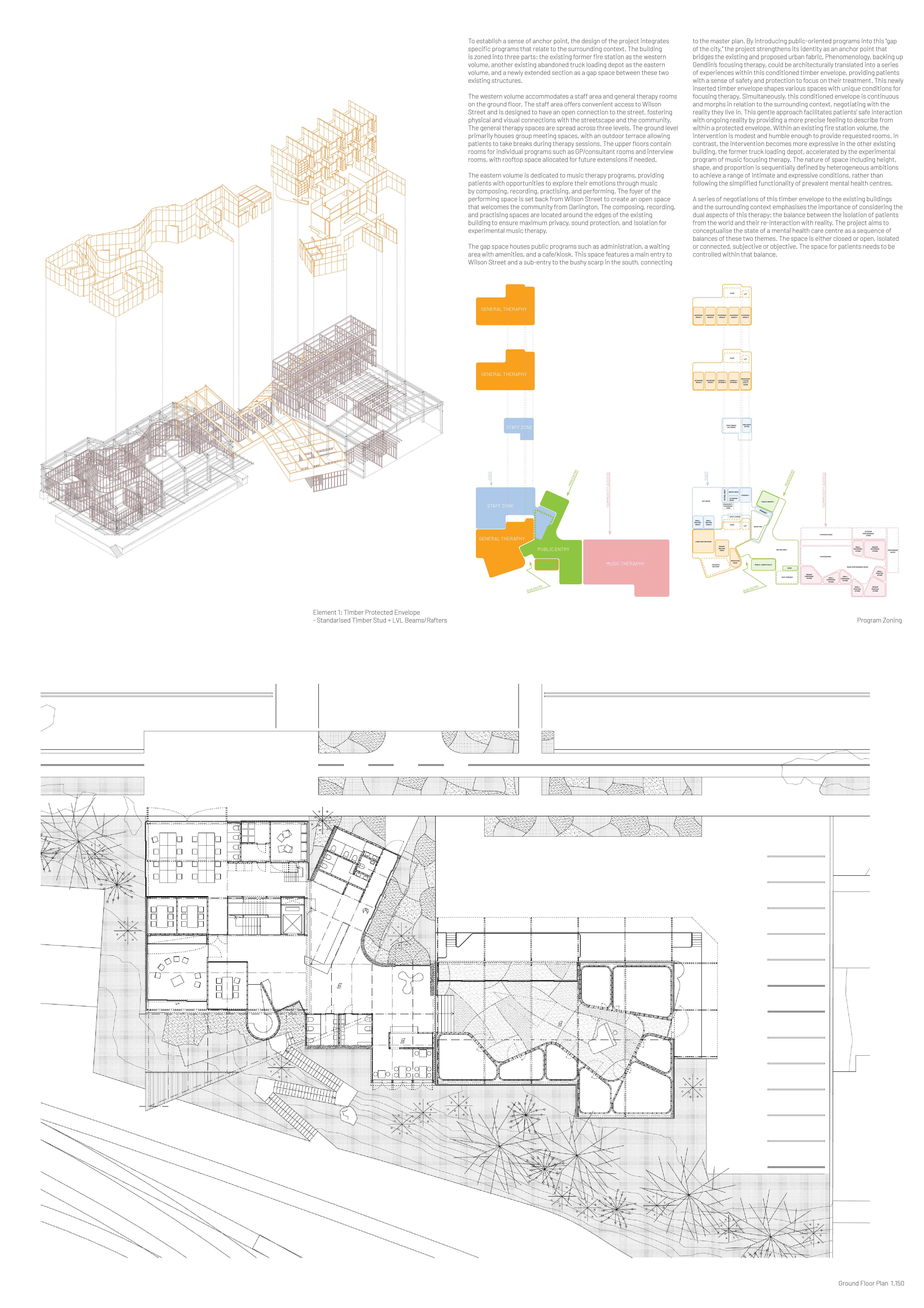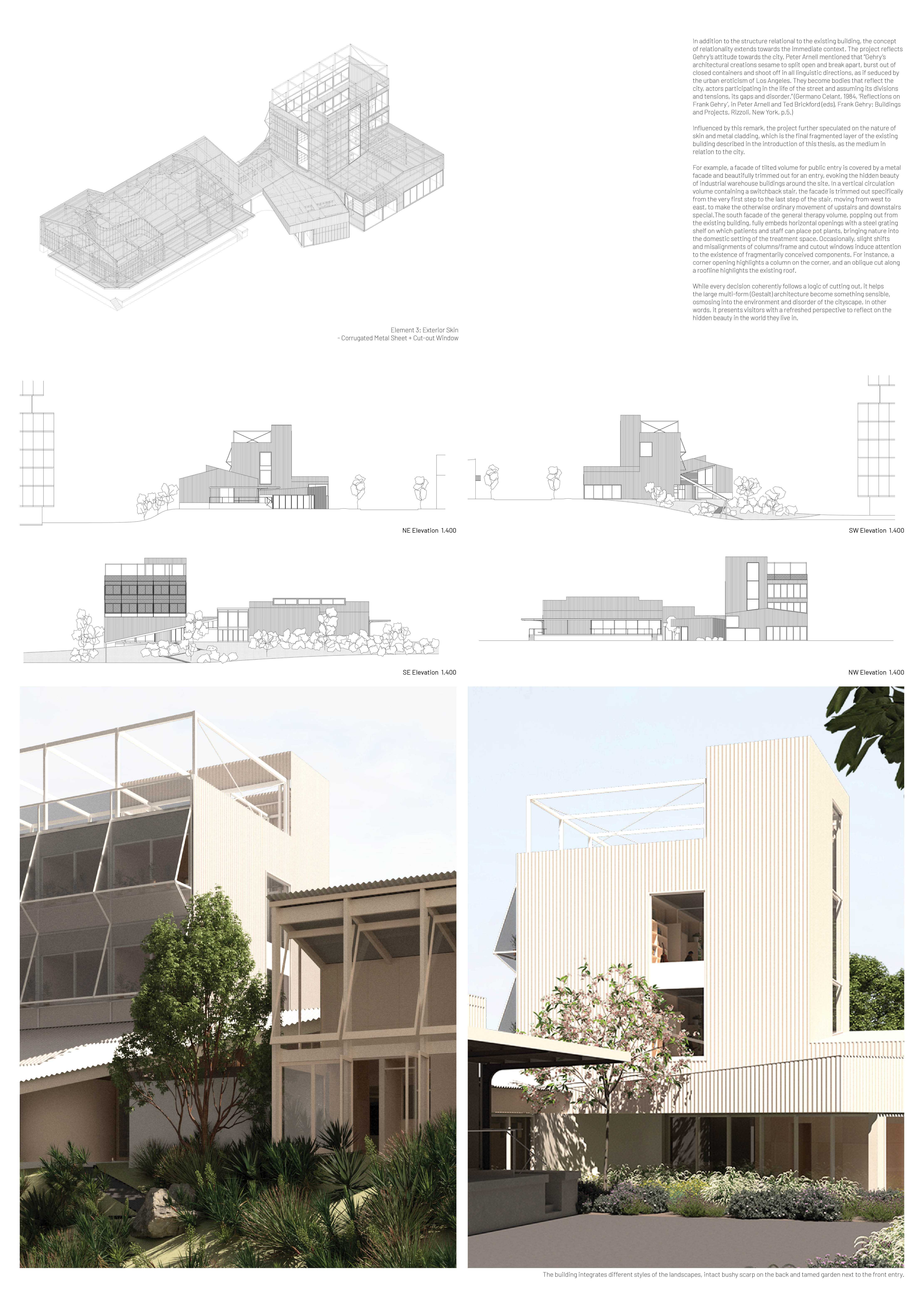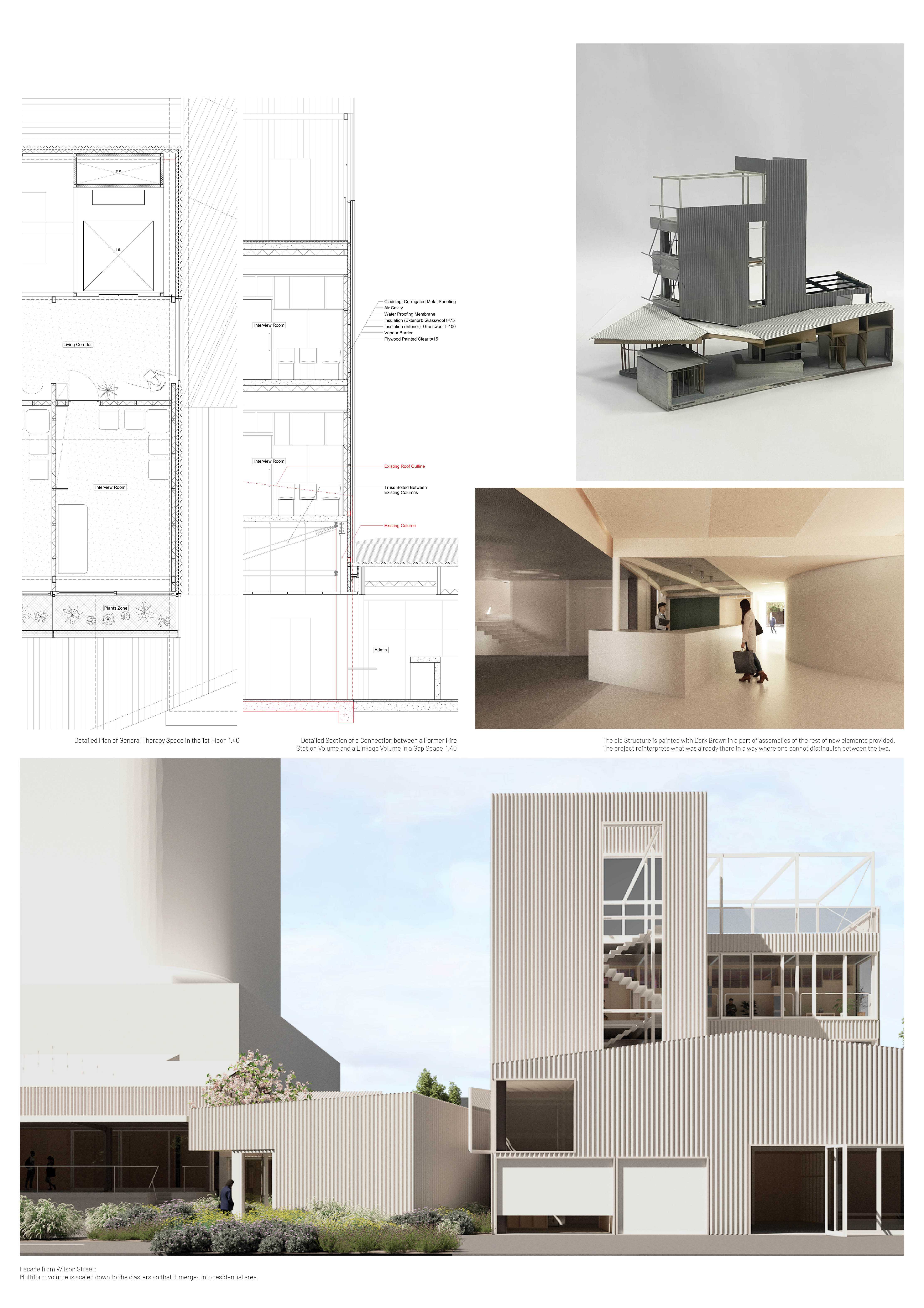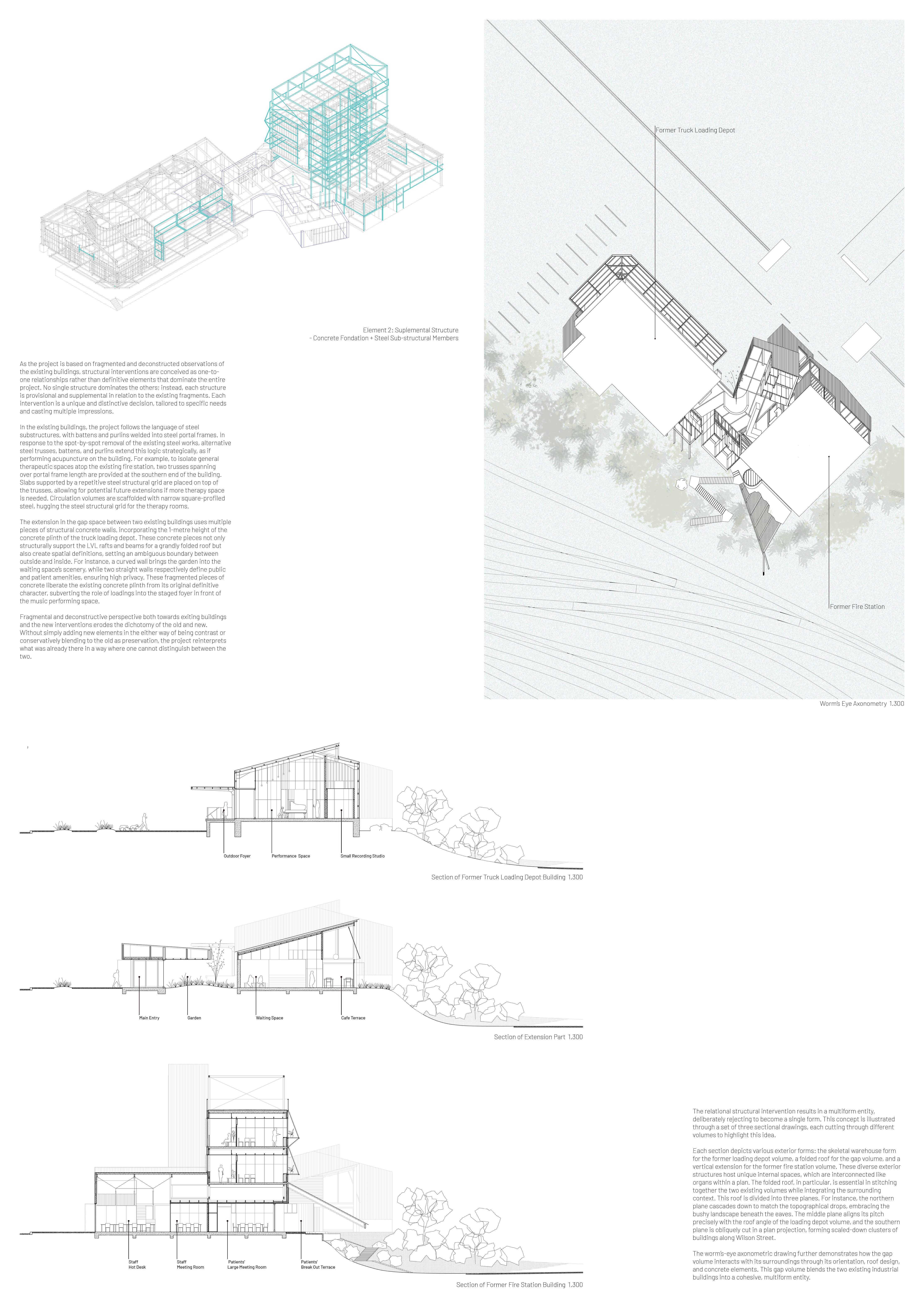 This project offers a new perspective that challenges traditional notions of the “form follows function” approach by reimagining existing buildings through fragmentation, deconstructivism, and phenomenology for adaptive reuse as a mental health care centre. It creates a dynamic and interconnected space for healing and reflection, providing a series of therapeutic experiences that facilitate a reconnection of patients, staff, and visitors to both existential and conceptual reality within a safe and engaging architectural framework.