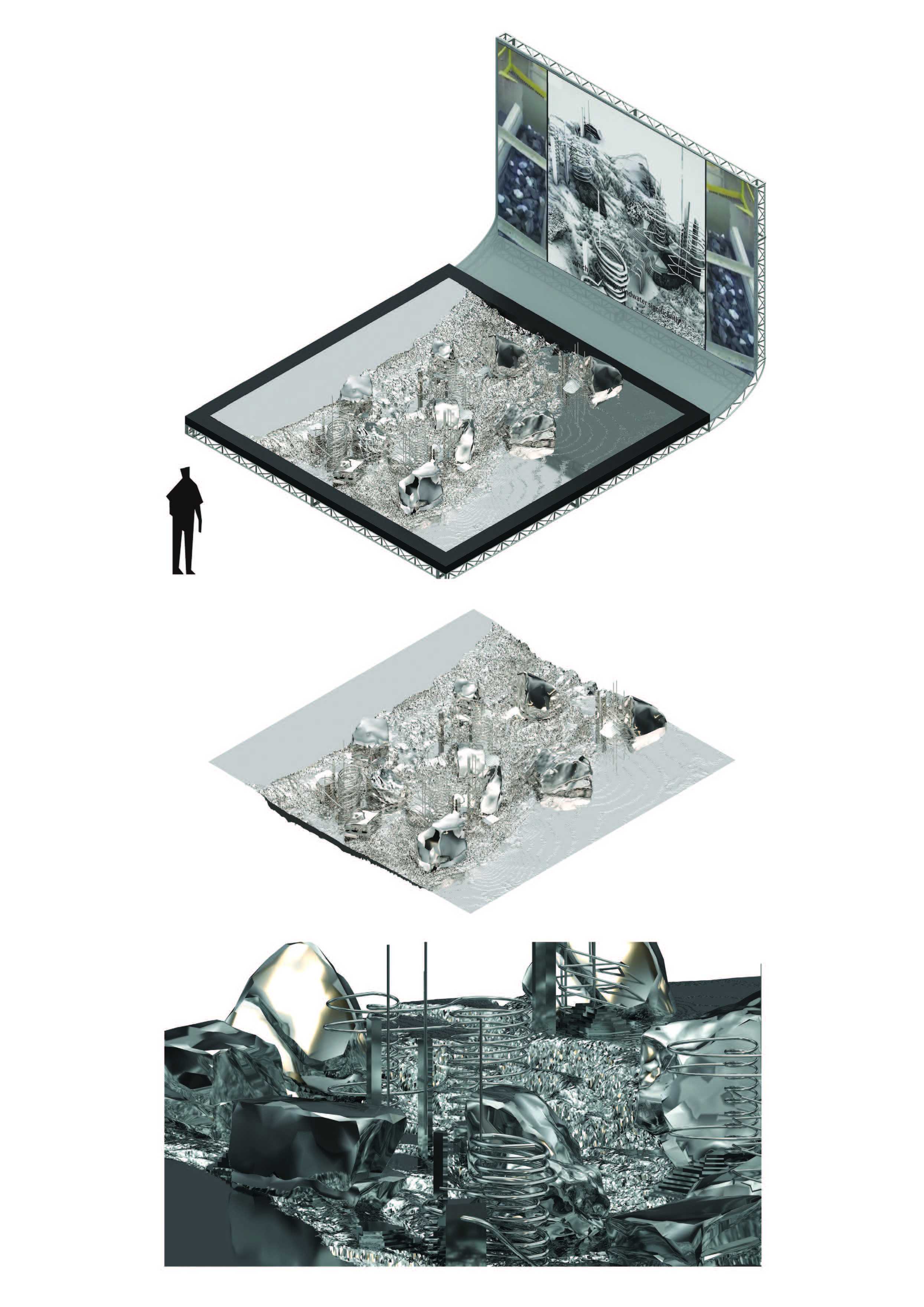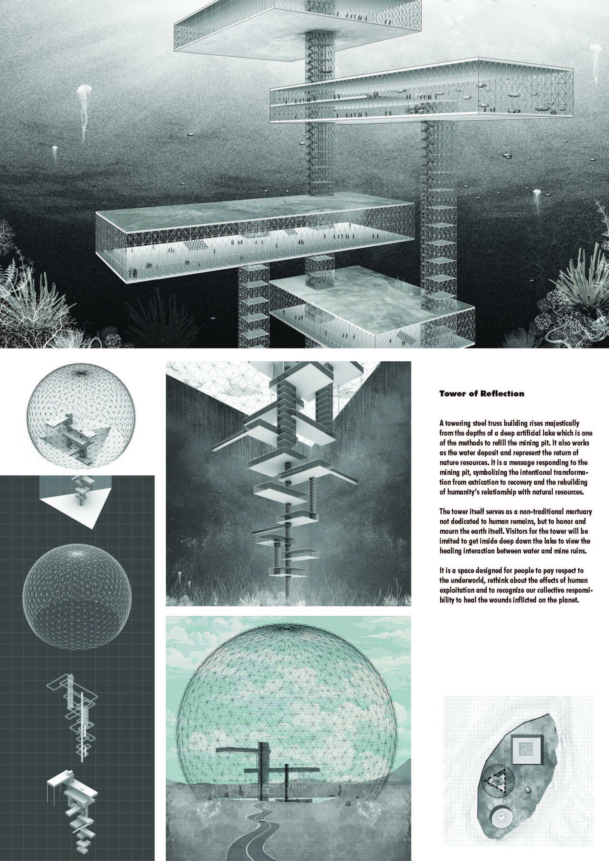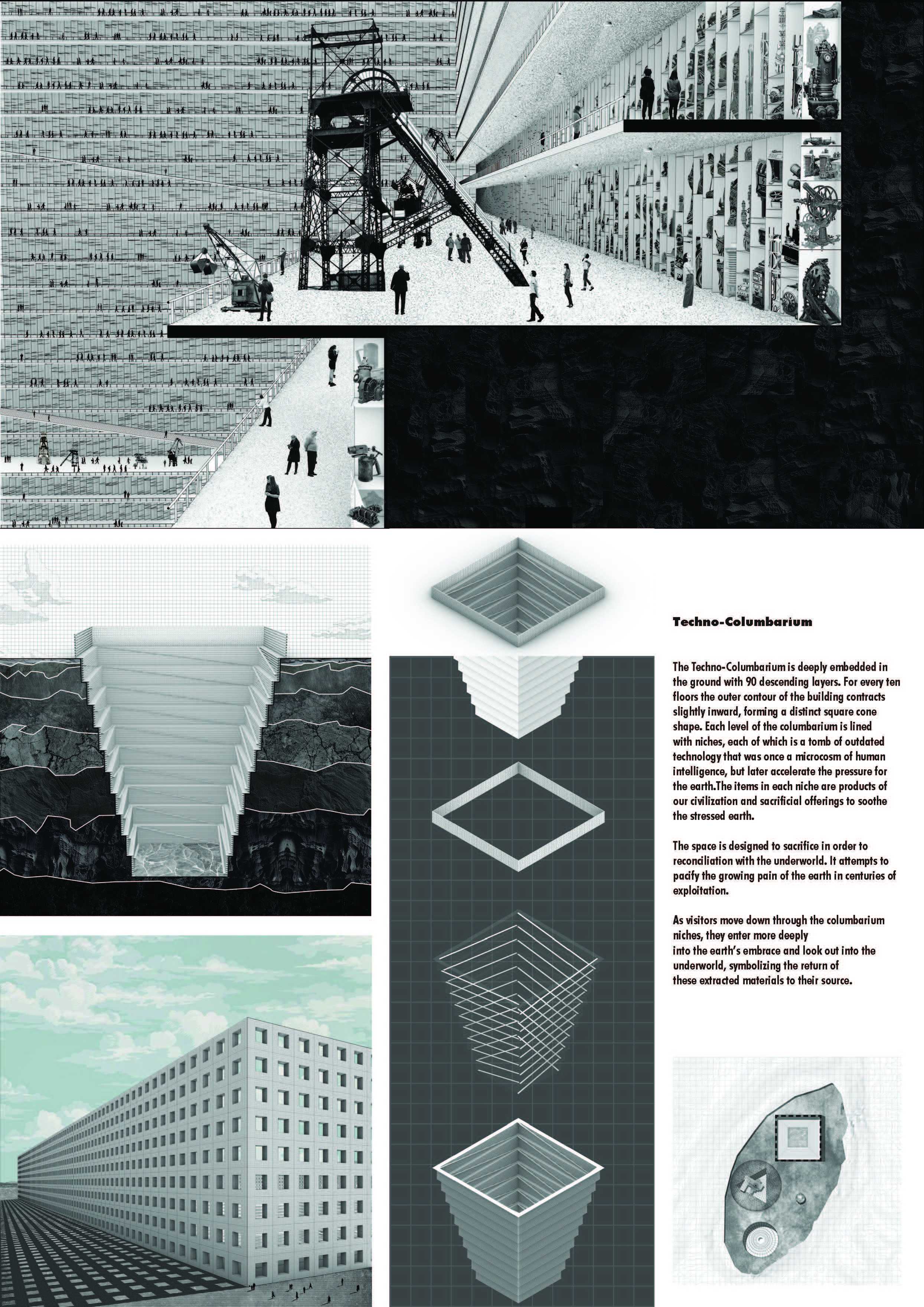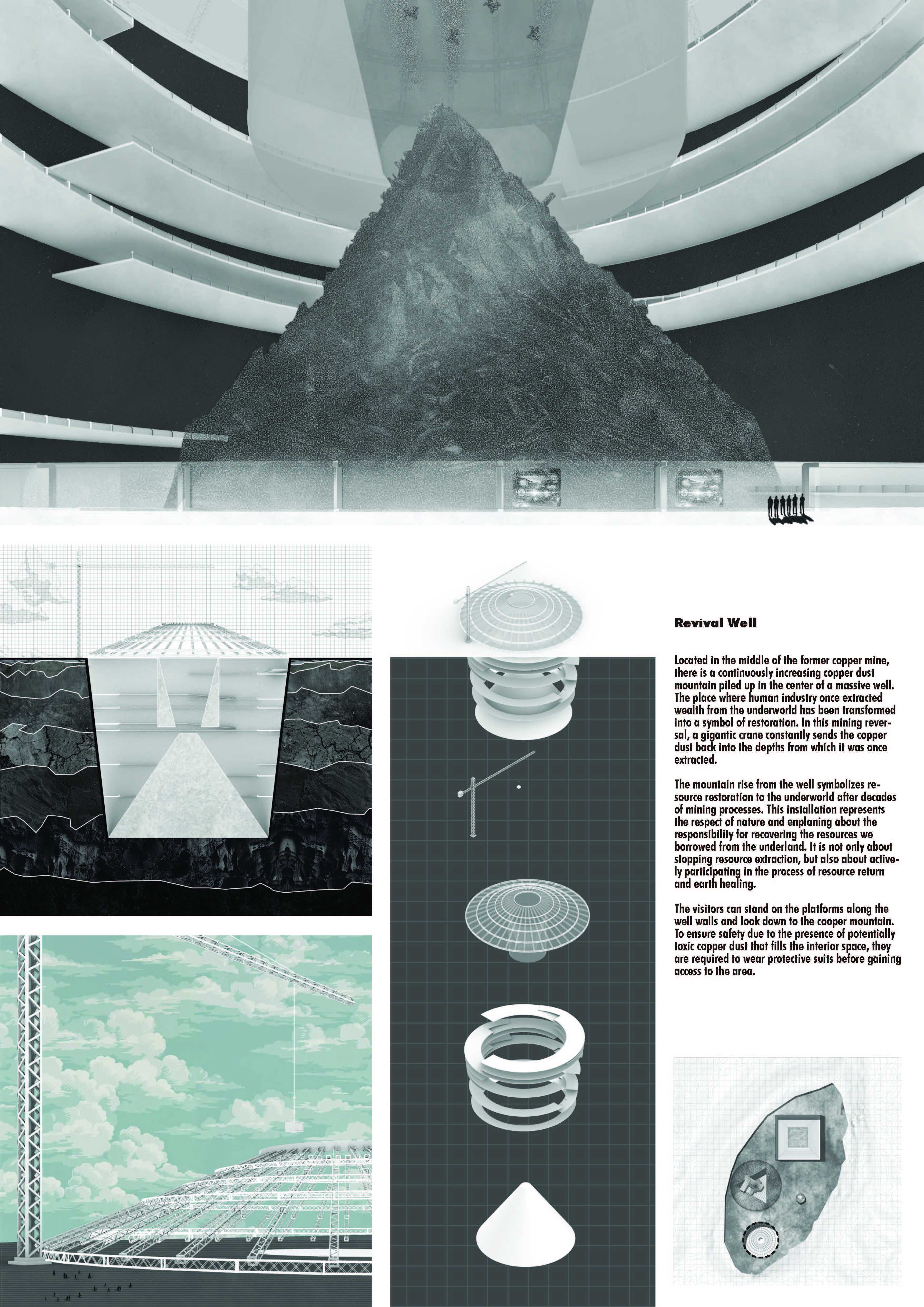 As technology advances, the demand for natural resources has surged, leading to environmental pressures from uncontrolled mining. This thesis critiques extractivism, focusing on the lithium triangle (Argentina, Bolivia, Chile), examining mining history, methods, and impacts on local communities and ecosystems. The study features three mine types (open pit, underground, brine) and their environmental impacts, illustrated with a three-dimensional map. To illustrate resource restoration, three architectural designs symbolize the transition from extraction to recovery. “Well of Copper Dust Mountain” features a giant well reclaiming copper dust. “The Techno-Columbarium” is an underground tomb for outdated technology. “Tower of Reflection” rises from an artificial lake, symbolizing nature's return.