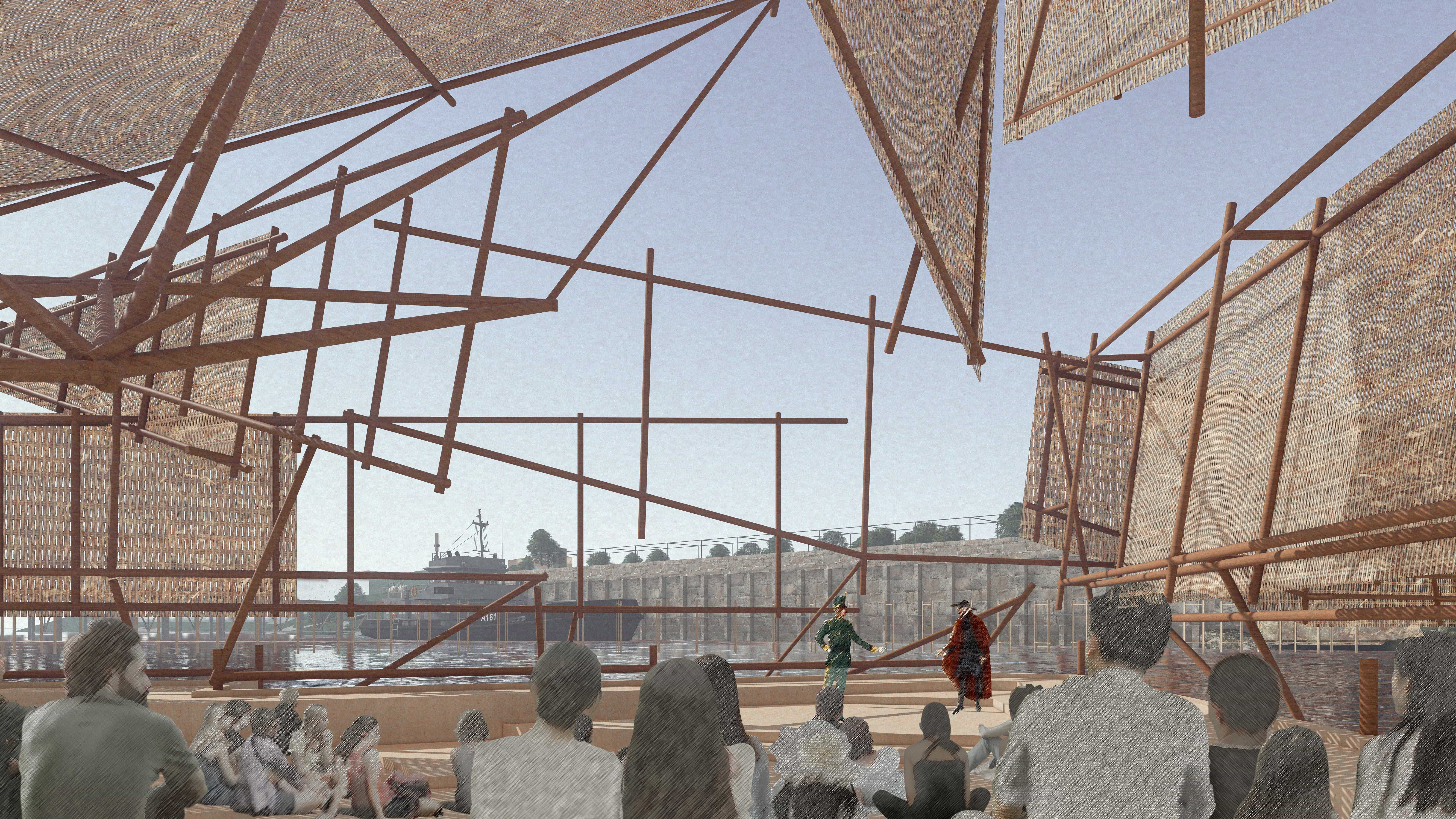 The theatre It’s Floating, It’s Changing responds to the complexity of Ball’s Head through shifting perspectives and interpretations. The design reflects the site’s changing external characteristics, with a stage that moves around Ball’s Head, offering different views. Performers and designers use movable panels to adapt the internal space, creating dynamic interactions between external and internal changes. As audiences step away from the site’s surface, they could experience new perspectives above the sea. This journey allows them to engage with evolving interpretations of Ball’s Head, inviting both performers and audiences to explore its rich potential.